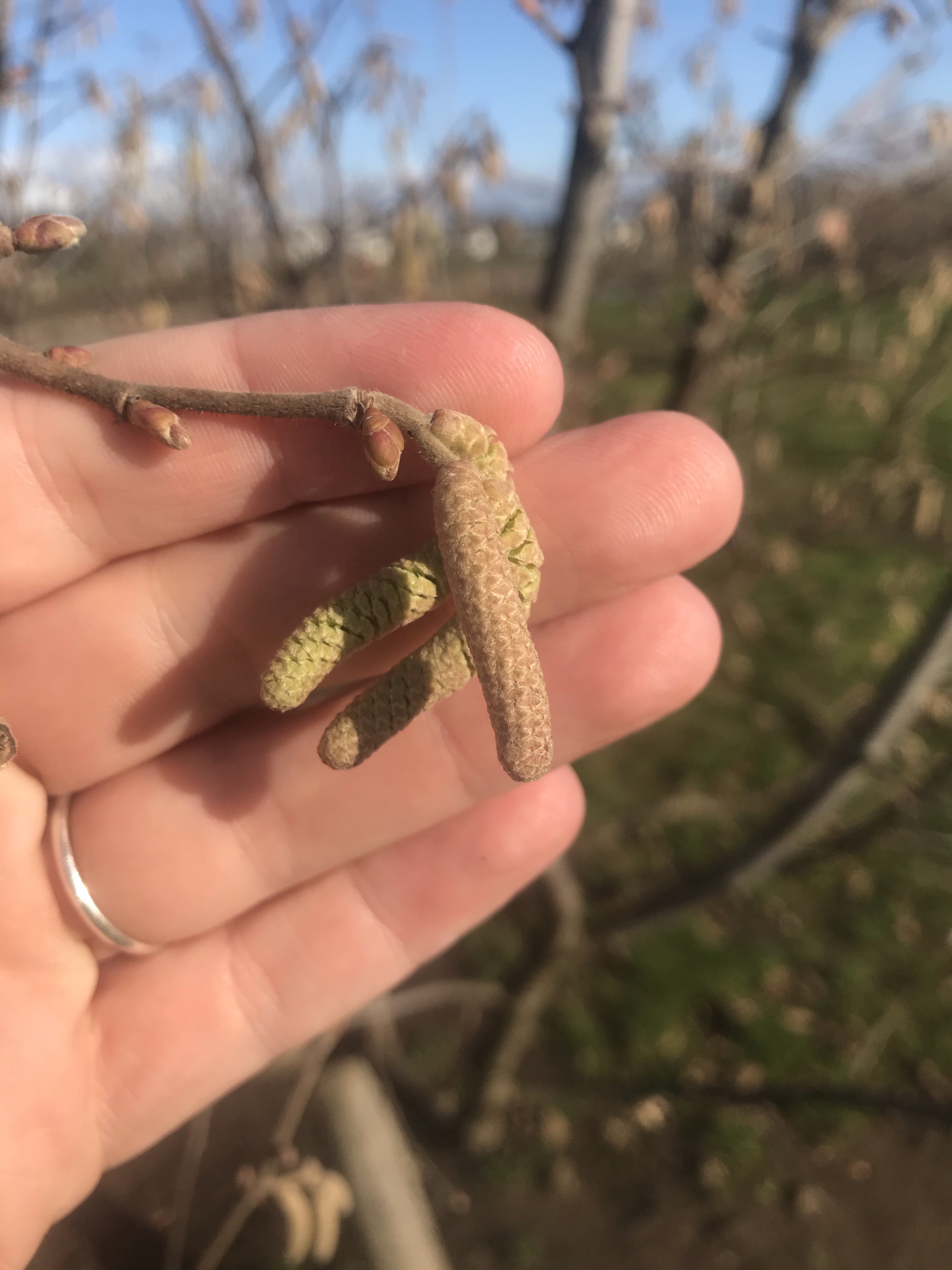 Hazelnut trees have catkins that hold all their pollen. As they start to mature the catkins begin to elongate and open up. When we get a little sunshine here during the winter they release pollen like crazy! I’m talking clouds and clouds if you drive by an orchard at the right time of day!